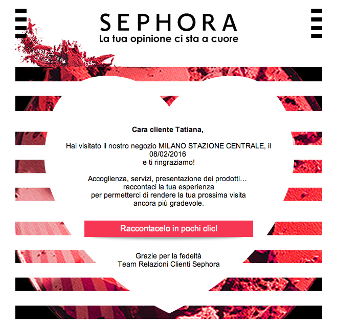 Ieri sono stata a Milano per seguire un corso. Arrivata in stazione Centrale con un po’ di anticipo, mi sono regalata un giro da Sephora. Sono cliente affezionata sia sullo store online sia in quello fisico e l’esperienza di acquisto è sempre piacevole, perché trovo lo stesso clima (credimi, non è sempre così scontato). Ho fatto i miei acquisti e me ne sono andata al corso. Oggi mi è arrivata una email da Sephora, piena d’amore già nell’oggetto: “Tatiana, ci ami veramente, follemente, profondamente?”