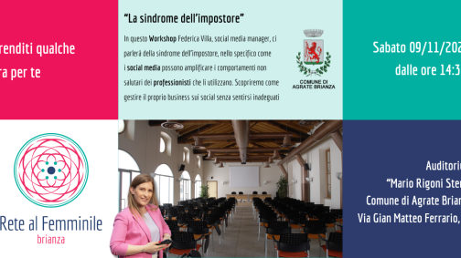 In questo workshop la nostra socia Federica Villa, social media manager, ci parlerà della sindrome dell’impostore, nello specifico di come i social media possono amplificare i comportamenti non salutare dei professionisti che li utilizzano. Scopriremo come gestire il proprio business sui social, senza sentirsi inadeguati. L’incontro si tiene presso l’auditorium “Mario Rigoni Stern” ad Agrate…